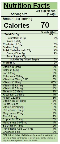 U.S. Department of Agriculture, Agricultural Research Service. 2016. USDA National Nutrient Database for Standard Reference, Release 28. USDA #09176 Mangos, raw.